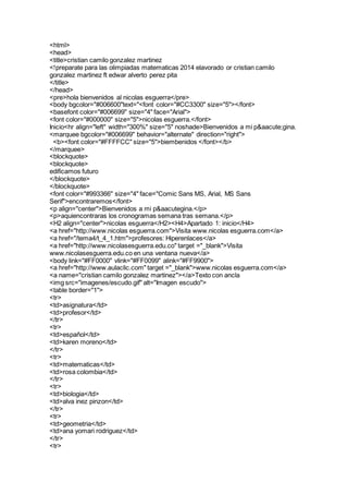 Este documento presenta la página web de bienvenida de la escuela Nicolás Esguerra. Incluye información sobre los programas, profesores y asignaturas de la escuela. Contiene enlaces a la página web de la escuela y a las páginas de los profesores, así como una tabla con la lista de asignaturas y los nombres de los profesores correspondientes.