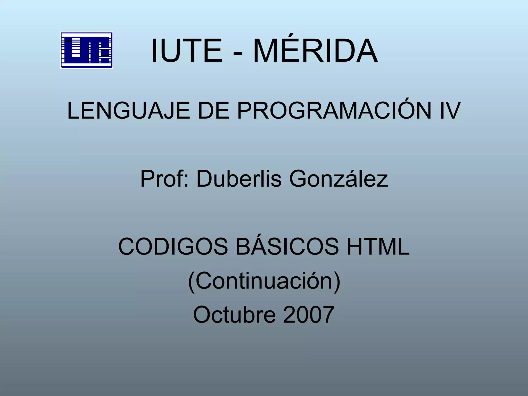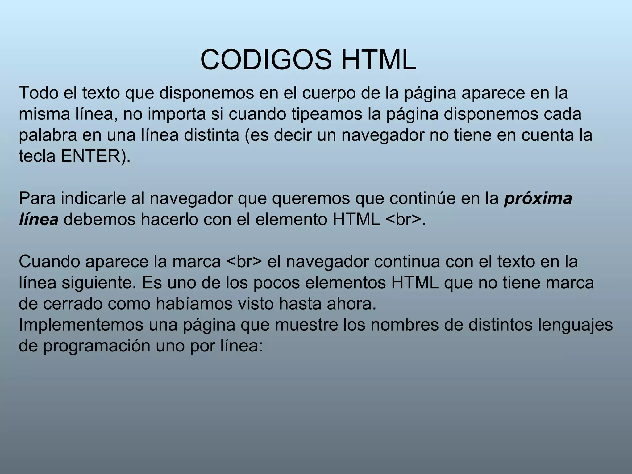 El documento proporciona información sobre códigos básicos de HTML. Explica cómo crear párrafos, hipervínculos, imágenes, listas ordenadas y no ordenadas, listas de definición y tablas. También cubre cómo enfatizar texto, agregar líneas de ruptura y anidar listas. Proporciona ejemplos de código HTML para ilustrar cada elemento.