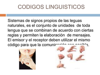 Este documento describe los diferentes tipos de códigos lingüísticos, incluyendo códigos naturales orales y escritos, y códigos no lingüísticos. Explica que los códigos lingüísticos son sistemas de signos que se combinan siguiendo reglas para crear mensajes, y que el emisor y receptor deben usar el mismo código para comunicarse. También distingue entre el código oral, que se transmite a través de los sentidos y no permanece, y el código escrito, que requiere aprendizaje y perm