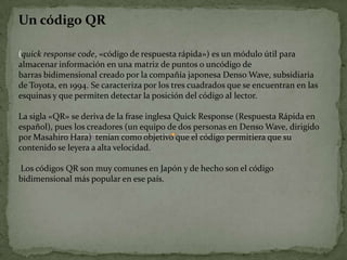 Un código QR es un código de barras bidimensional creado en 1994 que permite almacenar información como texto, URLs, contactos, etc. Puede ser leído por cámaras y escáneres y su objetivo original era permitir una lectura rápida de la información almacenada. Actualmente se usa comúnmente para publicidad, marketing y compartir información de forma sencilla desde cualquier dispositivo móvil.
