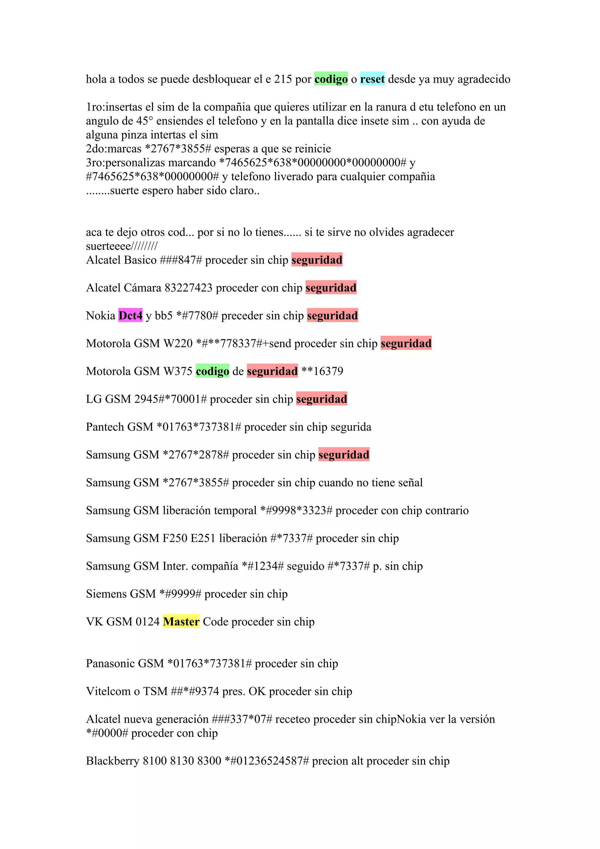 Este documento proporciona códigos y pasos para desbloquear teléfonos celulares de diferentes marcas como Alcatel, Nokia, Motorola, LG, Samsung, Siemens y otros. Incluye códigos para desbloquear sin chip de seguridad, cambiar el código de seguridad, desbloquear temporalmente y cambiar la compañía móvil. También incluye pasos para realizar un restablecimiento de fábrica en teléfonos LG.