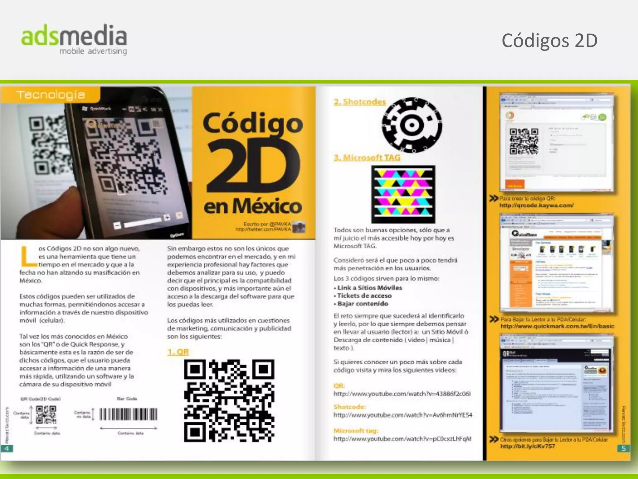 Este documento compara diferentes tipos de códigos 2D como QR Code, Shotcode, Semacode y Microsoft Tags. Explica sus características como la capacidad de almacenamiento de datos, cómo funcionan para codificar información, y proveedores. También identifica retos clave como desarrollar el destino adecuado y costos de navegación y descarga para cada código.