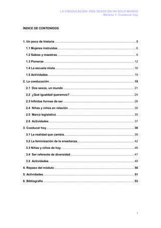 Este documento describe brevemente la historia de la educación de las mujeres. Explica que a lo largo de la historia ha habido momentos en los que se ha celebrado y otros en los que se ha despreciado el saber y la inteligencia de las mujeres. Menciona que en los primeros siglos del cristianismo hubo instituciones educativas regidas por mujeres destinadas a la educación de niñas y a la educación mixta. También habla sobre mujeres instruidas en la Edad Media como Hildegarda de Bingen y Hrotsvitha de Gandersheim.