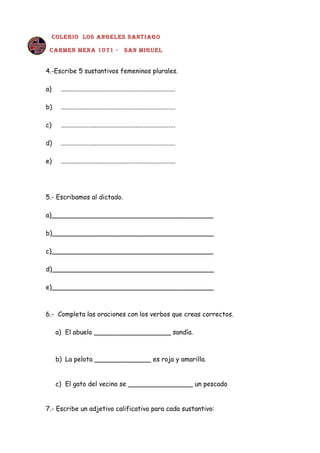 Este resumen describe una prueba de lenguaje y comunicación que incluye preguntas sobre sustantivos, verbos y adjetivos. Los estudiantes deben identificar y clasificar sustantivos, escribir sustantivos de género específico, completar oraciones con verbos adecuados, y leer y responder preguntas sobre un cuento. El cuento trata sobre un gusano que se encuentra con varios animales pero es atacado por una gallina, que resulta ser el "enemigo verdadero".