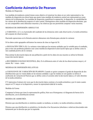 El documento define el coeficiente de asimetría de Pearson como una medida de la desviación de la simetría. Expresa la diferencia entre la media y la mediana con respecto a la desviación estándar del grupo de datos. Un valor de cero indica simetría, positivo indica asimetría a la derecha, y negativo indica asimetría a la izquierda. Luego proporciona ejemplos de cómo calcular el coeficiente de asimetría para diferentes conjuntos de datos.