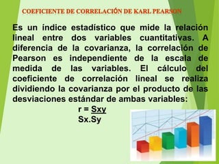 El documento describe la correlación de Pearson, un índice estadístico que mide la relación lineal entre dos variables cuantitativas, independiente de su escala de medida. Se detalla cómo calcular el coeficiente de correlación lineal, interpretando los resultados según su proximidad a +1 (correlación positiva) o -1 (correlación negativa). Además, se mencionan los pasos necesarios para el cálculo, incluyendo media aritmética, covarianza y desviación típica.