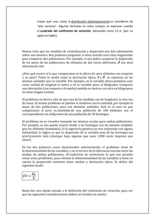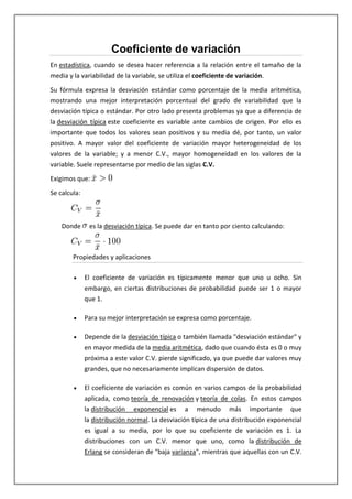 El documento explica que el coeficiente de variación mide la variabilidad de una variable en relación a su media, expresando la desviación estándar como un porcentaje de la media. Un coeficiente de variación más alto indica mayor heterogeneidad en los valores, mientras que uno más bajo indica mayor homogeneidad. Se usa para comparar la variabilidad de conjuntos de datos con unidades de medida diferentes.
