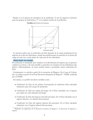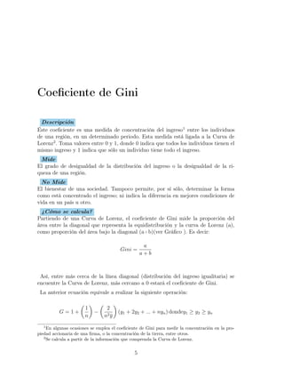 El coeficiente de Gini es una medida de desigualdad en la distribución del ingreso entre individuos de una región, que toma valores entre 0 y 1, donde valores más cercanos a 0 indican una distribución más igualitaria. Se calcula a partir de la Curva de Lorenz y mide la proporción del área entre la diagonal de equidistribución y la curva, como proporción del área total debajo de la diagonal. Es el indicador más utilizado para medir la desigualdad y permite comparar la situación de un país con otros.