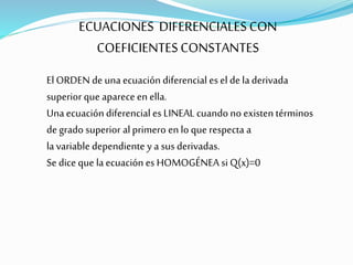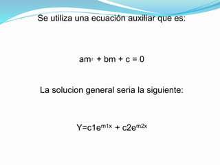 La ecuación diferencial es de orden 1 porque solo contiene la derivada primera. Es lineal porque solo incluye términos de primer grado de la variable dependiente y sus derivadas. Para resolverla se utiliza una ecuación auxiliar cuadrática y la solución general es la suma de dos términos que contienen las raíces de la ecuación auxiliar elevadas a x y multiplicadas por constantes.