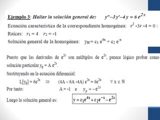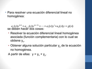 Para resolver ecuaciones diferenciales lineales no homogéneas, se debe resolver primero la ecuación homogénea asociada para obtener la solución complementaria, y luego proponer una forma para la solución particular basada en la forma de la función no homogénea, determinando los coeficientes para que satisfaga la ecuación. La solución general es la suma de la solución complementaria y la solución particular.