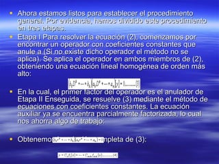 Este documento explica el método de coeficientes indeterminados para resolver ecuaciones lineales no homogéneas. El método involucra tres etapas: 1) encontrar un operador que anule el término no homogéneo, 2) resolver la ecuación homogénea resultante para obtener una solución general, y 3) determinar los valores de los coeficientes indeterminados sustituyendo en la ecuación original. Se provee un ejemplo completo para ilustrar el proceso.