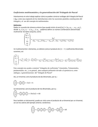 El documento explica cómo generalizar el triángulo de Pascal mediante el uso de coeficientes multinomiales. Define multinomiales como el producto de coeficientes binomiales sucesivos y muestra cómo esto permite construir triángulos de coeficientes para trinomiales, tetranomiales y polinomiales más altos como análogos del triángulo de Pascal. También resume brevemente la historia y propiedades básicas del triángulo de Pascal.