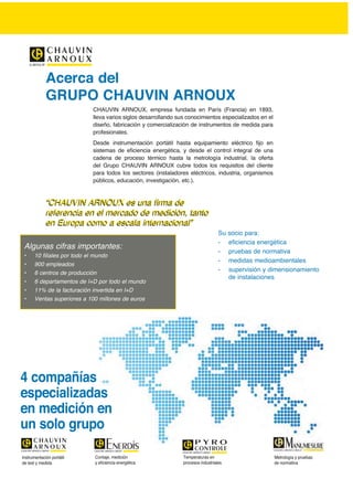 1) Chauvin Arnoux es una empresa francesa fundada en 1893 que se especializa en el diseño, fabricación y comercialización de instrumentos de medida para profesionales.