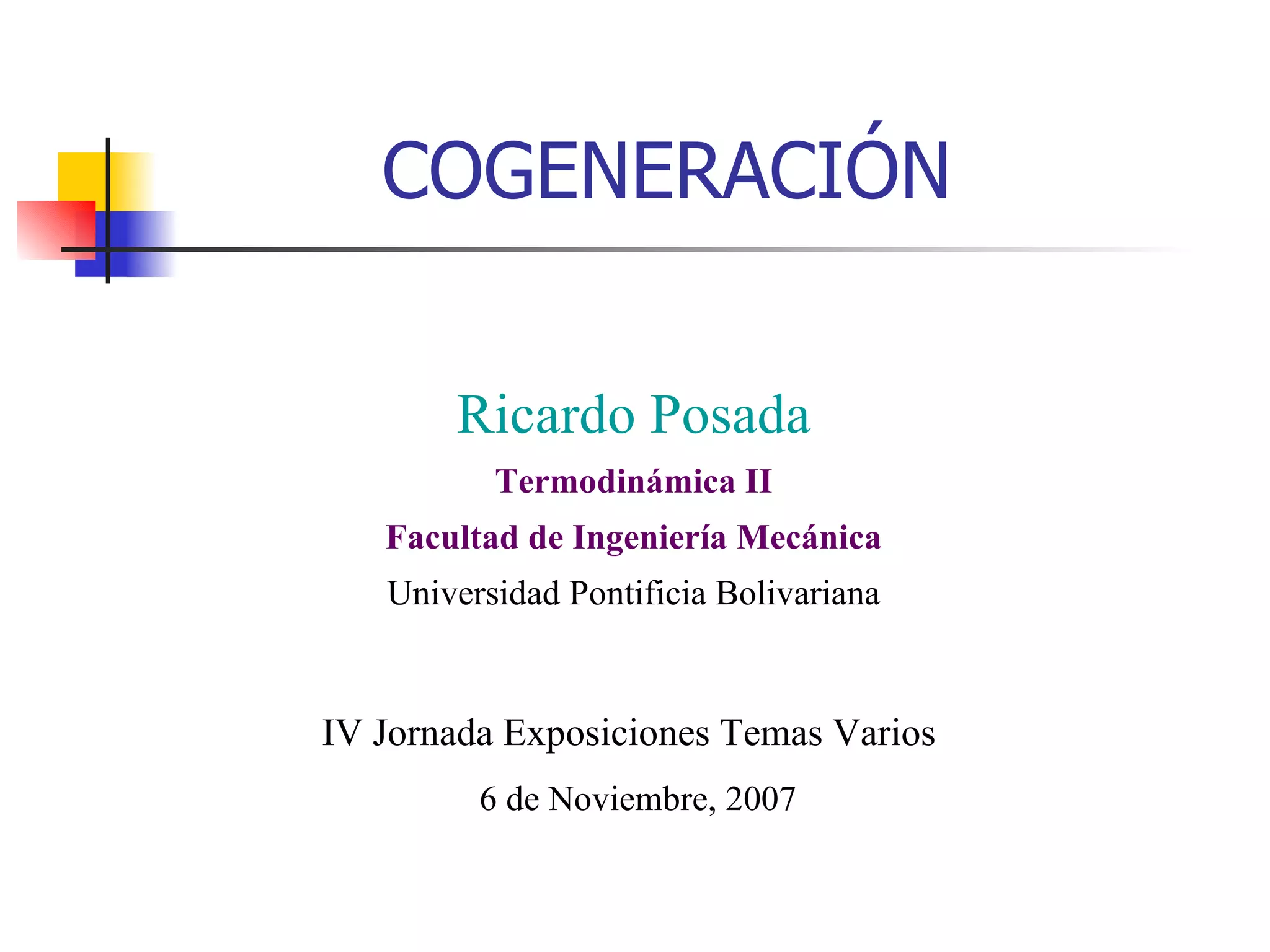 Este documento trata sobre la cogeneración. Explica que la cogeneración produce energía eléctrica y térmica de manera conjunta a partir de una misma fuente de energía primaria, logrando una mayor eficiencia. También describe las ventajas de la cogeneración como el ahorro de energía y menores emisiones. Finalmente, presenta dos ejemplos industriales de implementación de sistemas de cogeneración en Colombia.