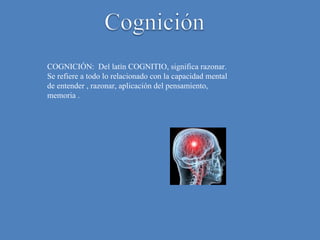 El documento habla sobre conceptos clave relacionados con la cognición. Define términos como percepción, aprendizaje, memoria, pensamiento, inteligencia y razonamiento. Explica que la cognición se refiere a la capacidad mental de entender, razonar y aplicar el pensamiento. También menciona que el neocórtex es la parte del cerebro responsable de los procesos de razonamiento y establecer nuevos conceptos o conclusiones basadas en tres principios: identidad, no contradicción y tercer excluido.