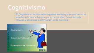 El documento describe las características principales del cognitivismo. Se enfoca en cómo las personas procesan y almacenan información, y define al ser humano como un procesador de información. También describe las etapas del desarrollo cognitivo según Jean Piaget y los roles del estudiante y el docente desde una perspectiva cognitiva.