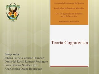 Este documento describe la teoría cognitivista del aprendizaje. Según esta teoría, el aprendizaje es el resultado de la organización y reorganización de los procesos cognitivos del individuo. La teoría se enfoca en cómo la mente procesa, interpreta y almacena información. Algunos precursores clave de esta teoría incluyen a Piaget, Vigotsky, Bruner y Ausubel.