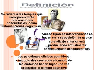 (1) Las terapias cognitivas y conductuales se basan en la premisa de que pensamientos y aprendizajes previos pueden estar produciendo consecuencias desadaptativas actuales. (2) Ambas terapias buscan modificar esquemas cognitivos mediante técnicas conductuales e intervenciones cognitivas. (3) La terapia cognitiva enfatiza que las emociones y conductas dependen de cómo se interpretan los eventos más que de los eventos mismos.