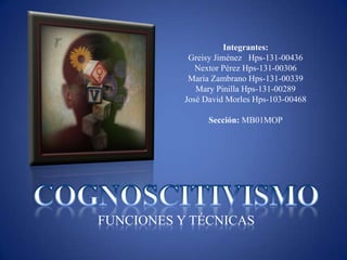 Este documento presenta la composición de un grupo de estudiantes de la sección MB01MOP. Cada estudiante describe brevemente conceptos y técnicas de la psicología cognitiva como la percepción, la memoria y el lenguaje. También se mencionan los métodos filosóficos, clínicos y experimentales utilizados en esta disciplina.