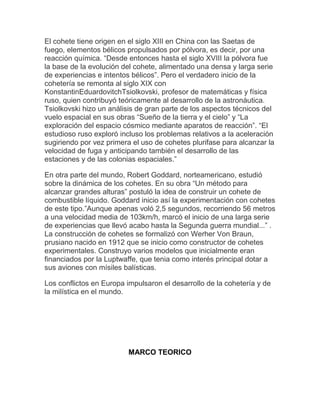 El documento describe un proyecto para construir un cohete impulsado por agua. El objetivo es comprender principios físicos como la ley de acción-reacción, el principio de Pascal, y la aerodinámica. Los estudiantes cortaron botellas de plástico, agregaron aletas de madera o cartón, e introdujeron aire en las botellas llenas de agua usando una bomba para impulsar el cohete. Realizaron pruebas con diferentes diseños para determinar cuál funcionaba mejor.