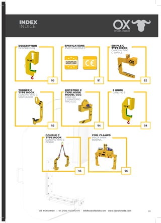 El documento proporciona información sobre los ganchos tipo 'c' y 'j' y las pinzas para bobina fabricadas por Ox Worldwide, destacando sus características de diseño, materiales utilizados y opciones de personalización. Estos elementos están destinados a la elevación y transporte equilibrado de bobinas y piezas industriales, cumpliendo con diversas normativas de seguridad. Además, se detallan especificaciones técnicas, opciones de fijación y acabados disponibles para los productos.