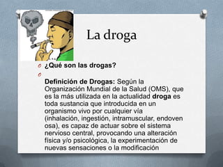 El aseo personal consiste en mantener limpia y libre de impurezas la piel, dientes, cabello, cuero cabelludo, oídos, orificios nasales, manos, pies y partes genitales a través de actos autónomos de higiene. Según la Organización Mundial de la Salud, las drogas son sustancias que introducidas en un organismo vivo por cualquier vía, son capaces de actuar sobre el sistema nervioso central y provocar alteraciones físicas y/o psicológicas o la modificación de sensaciones