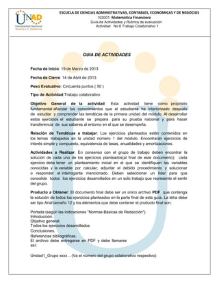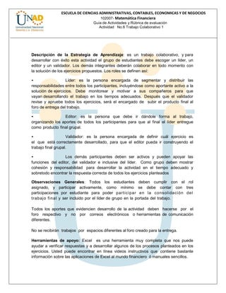 Este documento presenta una guía para un trabajo colaborativo en matemática financiera. El trabajo involucra resolver ejercicios en temas como interés simple y compuesto, tasas de equivalencia, anualidades y amortizaciones. Los estudiantes deben formar grupos, asignar roles como líder, editor y validador, y desarrollar conjuntamente las soluciones. El producto final es un documento PDF que incluye la solución de todos los ejercicios propuestos siguiendo un formato específico. El trabajo será evaluado según criterios como la