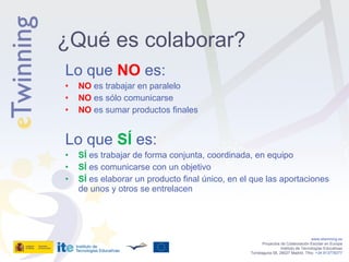 El documento describe los conceptos clave de la colaboración en el aula, incluyendo que implica trabajar de forma conjunta y coordinada en lugar de de forma paralela, y que los productos finales deben entrelazar las contribuciones de todos. También discute los desafíos de la colaboración y cómo diseñar actividades que hagan que la colaboración sea la forma más efectiva para que los estudiantes alcancen sus objetivos.