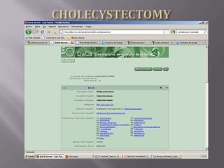 Este documento proporciona información sobre la colecistectomía, que es la extirpación quirúrgica de la vesícula biliar. Describe dos métodos principales para realizar esta cirugía: la colecistectomía laparoscópica, que utiliza pequeñas incisiones, y la colecistectomía abierta más invasiva. También discute los avances en técnicas mínimamente invasivas como NOTES y la cirugía robótica para tratar afecciones de la vesícula biliar.
