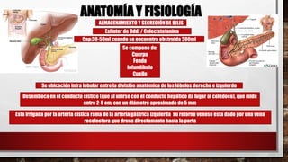La vesícula biliar almacena y secreta la bilis, un líquido compuesto principalmente de agua, colesterol, sales biliares y enzimas. La colecistitis aguda se produce cuando los cálculos biliares obstruyen el conducto cístico, causando inflamación, distensión e isquemia de la vesícula. Los síntomas incluyen dolor abdominal y fiebre. El ultrasonido y la colangiopancreatografía retrograda son exámenes útiles para el diagnóstico. El tratamiento consiste generalmente en la admin