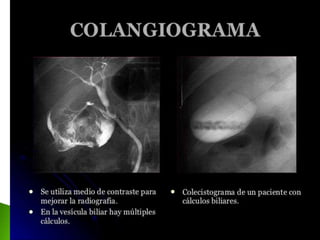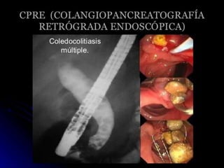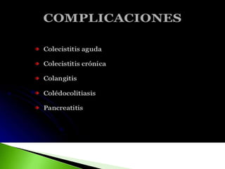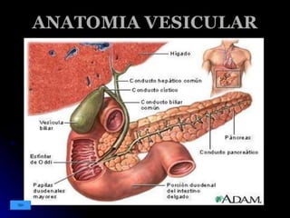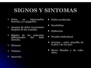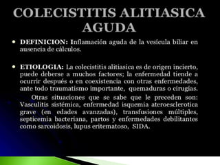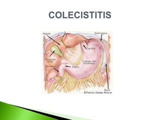 La colecistitis aguda es una inflamación de la vesícula biliar que causa un intenso dolor abdominal, generalmente en la parte superior derecha. Los síntomas principales incluyen dolor abdominal agudo que puede irradiarse a la espalda, náuseas, vómitos y fiebre. El tratamiento depende de la gravedad y puede incluir dieta baja en grasas, hidratación intravenosa, antibióticos, o en casos graves, cirugía para extirpar la vesícula biliar.