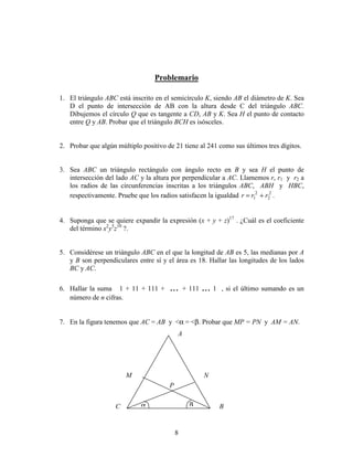 1. El documento presenta un conjunto de 56 problemas matemáticos resueltos para estudiantes de alto rendimiento. Los problemas abarcan temas como geometría, teoría de números, álgebra y otras ramas de las matemáticas. Cada problema viene acompañado de su enunciado y una breve explicación de la solución. El documento busca servir de apoyo para la preparación de olimpiadas y concursos matemáticos.