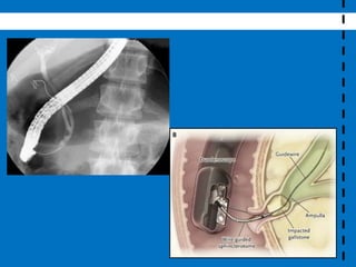 Este documento describe la coledocolitiasis, que es la presencia de cálculos en el conducto biliar principal. Explica que entre el 10-15% de los pacientes con colelitiasis desarrollarán un cálculo que pasará al conducto biliar principal. Los síntomas incluyen cólico biliar, elevación de enzimas hepáticas y bilirrubina. El diagnóstico se realiza con pruebas de función hepática, ultrasonido y resonancia magnética. El tratamiento implica la papilotomía endoscópica y extracción del c