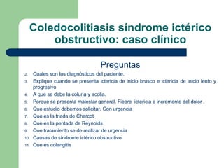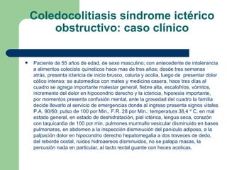 Este documento presenta el caso de un paciente masculino de 55 años con ictericia de inicio brusco, coluria y acolia que fue diagnosticado con coledocolitiasis, colangitis y odditis. Describe los síntomas, exámenes de diagnóstico y tratamiento quirúrgico y endoscópico para estas afecciones del sistema biliar.