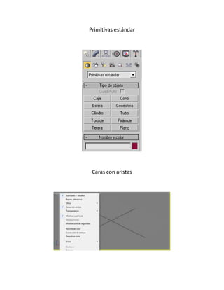 Este documento presenta algunas figuras geométricas básicas como esferas y cubos. Describe las herramientas de seleccionar, mover, rotar y escalar uniformemente que permiten modificar estas figuras tridimensionales en un programa de modelado 3D. Explica cómo usar estas herramientas para transportar, hacer girar y cambiar el tamaño de un objeto de manera uniforme.
