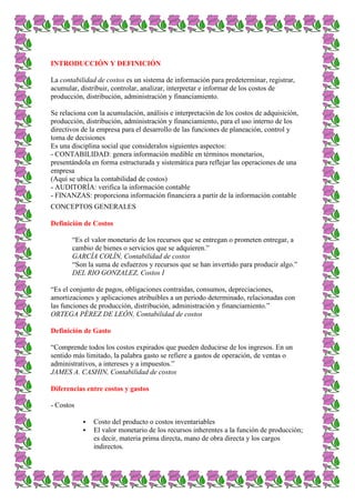 El documento presenta una introducción a la contabilidad de costos, definiendo conceptos como costos, gastos, clasificaciones de costos y gastos. Explica las diferencias entre una empresa comercial y una de transformación, describiendo las funciones de producción, distribución y administración de una empresa de transformación. Finalmente, describe sistemas de costeo y técnicas de valuación de inventarios como costos estimados y estándares.