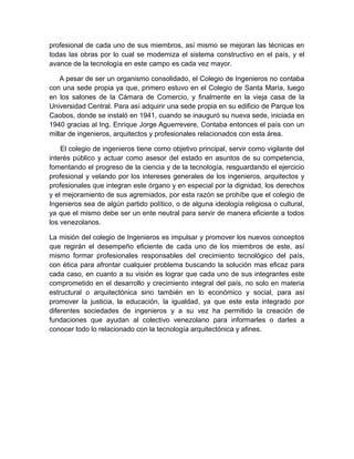 El Colegio de Ingenieros de Venezuela se fundó en 1861 para reunir a los ingenieros del país y servir como asesor del estado en asuntos técnicos. Originalmente dependía del estado pero luego se adscribió al Ministerio de Educación. Aunque tuvo varias sedes, en 1941 se inauguró su propio edificio en Parque los Caobos. El Colegio busca fomentar el progreso científico y tecnológico, resguardar la ética profesional de los ingenieros y velar por los intereses generales del gremio
