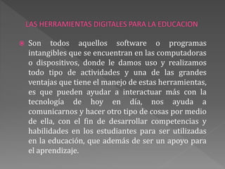 El documento aborda la importancia de las herramientas digitales en la educación, destacando su papel en el aprendizaje y la alfabetización digital de estudiantes y docentes. Se mencionan diversos tipos de software y aplicaciones que facilitan la enseñanza, comunicación y gestión educativa. Además, se enfatiza la necesidad de que los educadores adopten y adapten estas tecnologías para mejorar el proceso educativo.
