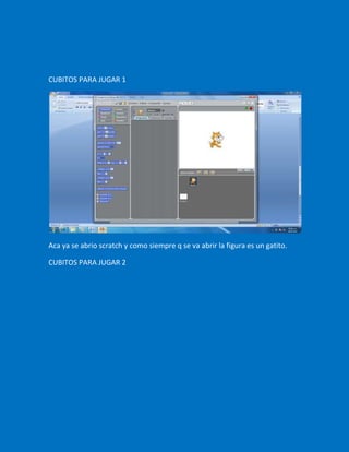 Este documento describe un juego de cubitos creado en Scratch por dos estudiantes del Colegio Nacional Nicolás Esguerra. Los estudiantes Jefferson Steven Guzmán Morales y Ailton Alberto Hoyos Barriosnuevos crearon cubitos azules utilizando la herramienta Scratch y los programaron para que puedan ser copiados y colocados en la pantalla, permitiendo armar configuraciones diferentes.