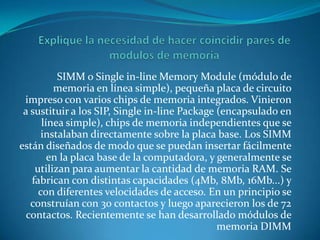 Los SIMM o módulos de memoria en línea simple son placas de circuito impreso pequeñas con varios chips de memoria integrados que se usan para aumentar la memoria RAM de una computadora. Se insertan fácilmente en la placa base y vienen en diferentes capacidades como 4Mb, 8Mb y 16Mb. Inicialmente tenían 30 contactos pero luego aparecieron los de 72 contactos. Actualmente el sistema operativo Windows XP requiere al menos 64Mb de memoria para instalarse.