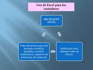 El documento presenta una introducción al uso de Excel para contadores, destacando que es una hoja electrónica que permite construir planillas, cuadros estadísticos y registros, y que agiliza el trabajo con grandes lotes de datos, además de facilitar representaciones gráficas para una mejor explicación de datos complejos.