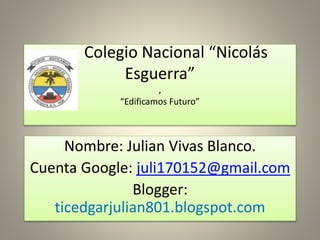 El documento presenta la información personal de Julian Vivas Blanco, un estudiante del Colegio Nacional "Nicolás Esguerra" que incluye su nombre, cuenta de correo electrónico de Google y blog personal, el cual se enfoca en la realización de personajes del popular programa de televisión South Park.