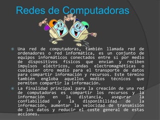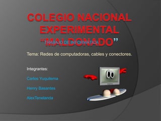 Este documento resume los diferentes tipos de redes de computadoras (LAN, MAN, WAN), cables (par trenzado, coaxial, fibra óptica) y conectores (RJ-45, fibra óptica como FC, LC, ST; coaxial como TNC, BNC, N-Hembra) utilizados en las redes. Explica brevemente el propósito de cada red y cable, así como los tipos de conectores estándar para cada uno.