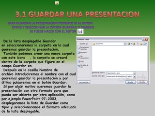 Este documento explica cómo guardar una presentación de PowerPoint. Se selecciona la carpeta de destino y se introduce un nombre de archivo. Para guardar la presentación en otro formato, se selecciona ese formato de la lista desplegable. Para guardar la presentación como página web, se selecciona la opción "Página Web" o "Página Web de un solo archivo".