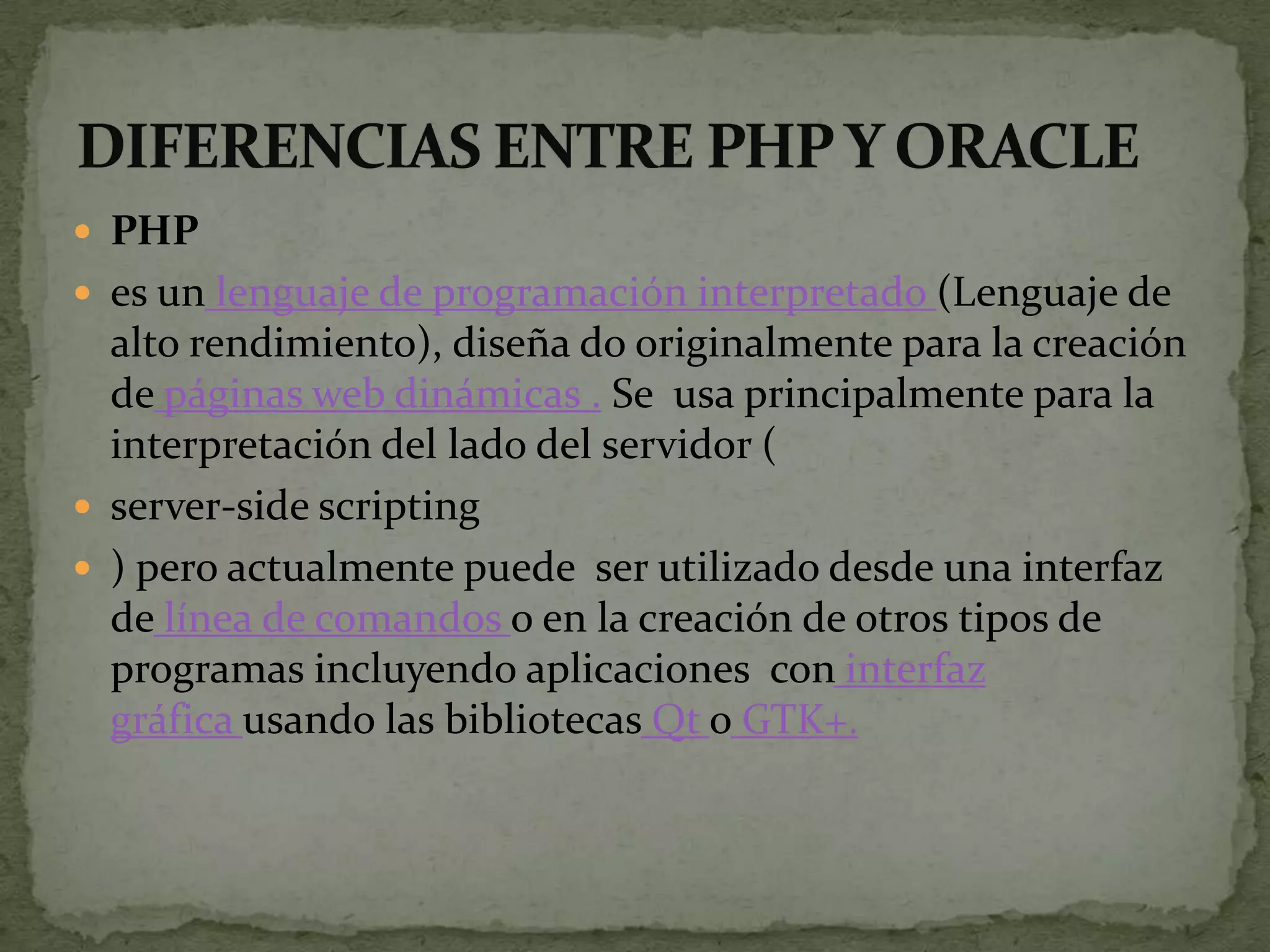 PHP es un lenguaje de programación interpretado orientado al desarrollo de aplicaciones web dinámicas con acceso a bases de datos. Originalmente diseñado para crear páginas web dinámicas, PHP también se puede usar para línea de comandos u otras aplicaciones. El código PHP se ejecuta en el servidor de forma segura y confiable. PHP permite conectarse a muchas bases de datos y expandir sus capacidades a través de módulos.