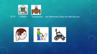 El Colegio de Educación Especial trabaja con estudiantes con diferentes discapacidades y proporciona materiales adaptados como andadores y bicicletas para fisioterapia. Cuenta con una sala multisensorial que ayuda a los estudiantes a descubrir, explorar, interactuar y comunicarse en ambientes estimulantes mediante luces, videos y pictogramas. El colegio también enseña el uso de señas y promueve valores como escuchar a los maestros y hablar con respeto.