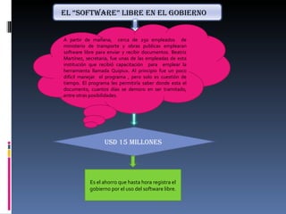 A partir de mañana, aproximadamente 250 empleados del Ministerio de Transporte y Obras Públicas de Perú usarán software libre como Quipiux para enviar y recibir documentos de forma digital. Aunque al principio fue difícil de usar para algunos, el software les permitirá rastrear documentos y saber cuánto tiempo tardan en procesarse. El gobierno de Perú ha ahorrado USD 15 millones hasta la fecha gracias al uso de software libre.