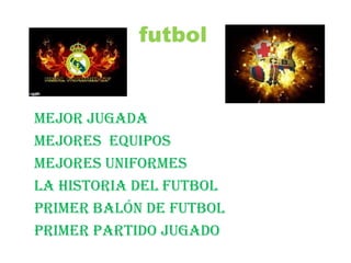 Este documento contiene información sobre varios temas relacionados con el fútbol como la mejor jugada realizada por Fernando Redondo para el Manchester United, los mejores equipos y jugadores como Peñarol en la década de 1960, la historia del primer balón y partido jugado, y los trofeos entregados a los ganadores de la Copa del Mundo.