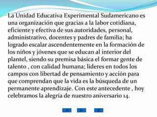 La Unidad Educativa Experimental Sudamericano celebra su 14o aniversario. Fue fundada en 1998 por Manuel Alonso Manitio con el objetivo de formar personas de talento con calidad humana a través de una educación efectiva basada en principios y valores. La institución ofrece educación básica de primero a décimo año y bachilleratos en informática, turismo y gastronomía.