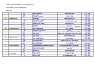 El documento presenta un resumen de las instituciones educativas privadas en el departamento de Montevideo Este en el año 2016, dividiéndolas por distritos e incluyendo información sobre el inspector a cargo, cantidad de habitaciones, autorizaciones, nombre de la institución y su dirección y teléfono. En total se listan 222 colegios privados inspectados ese año en Montevideo Este.